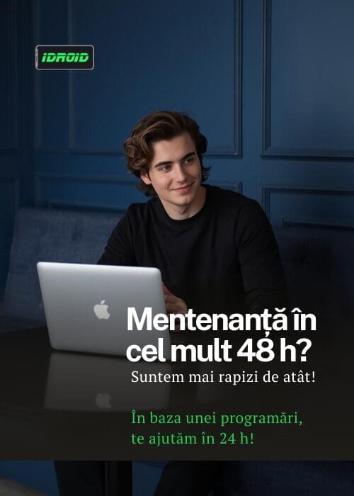 La iDROID Timișoara oferim servicii complete: reparații telefoane GSM (iPhone, Samsung, Xiaomi), console (PlayStation, Xbox), laptopuri (Apple Macbook, Lenovo, Asus), roboți casnici (Roborock), drone DJI, și televizoare (Samsung, LG, Philips).